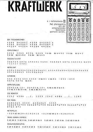 In 1981, Kraftwerk sold a nice merchandise item on their concerts: a Casio VL-80 calculator with Kraftwerk print on pouch and display, complete with a Kraftwerk songsheet. This technological wonder of the early eighties was quite expensive, so only a few were sold at the concerts. The Kraftwerk notations are for the following songs: |